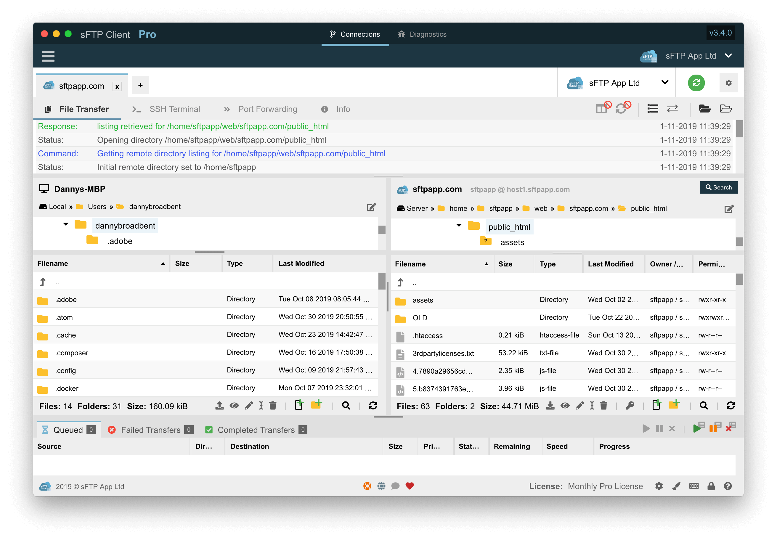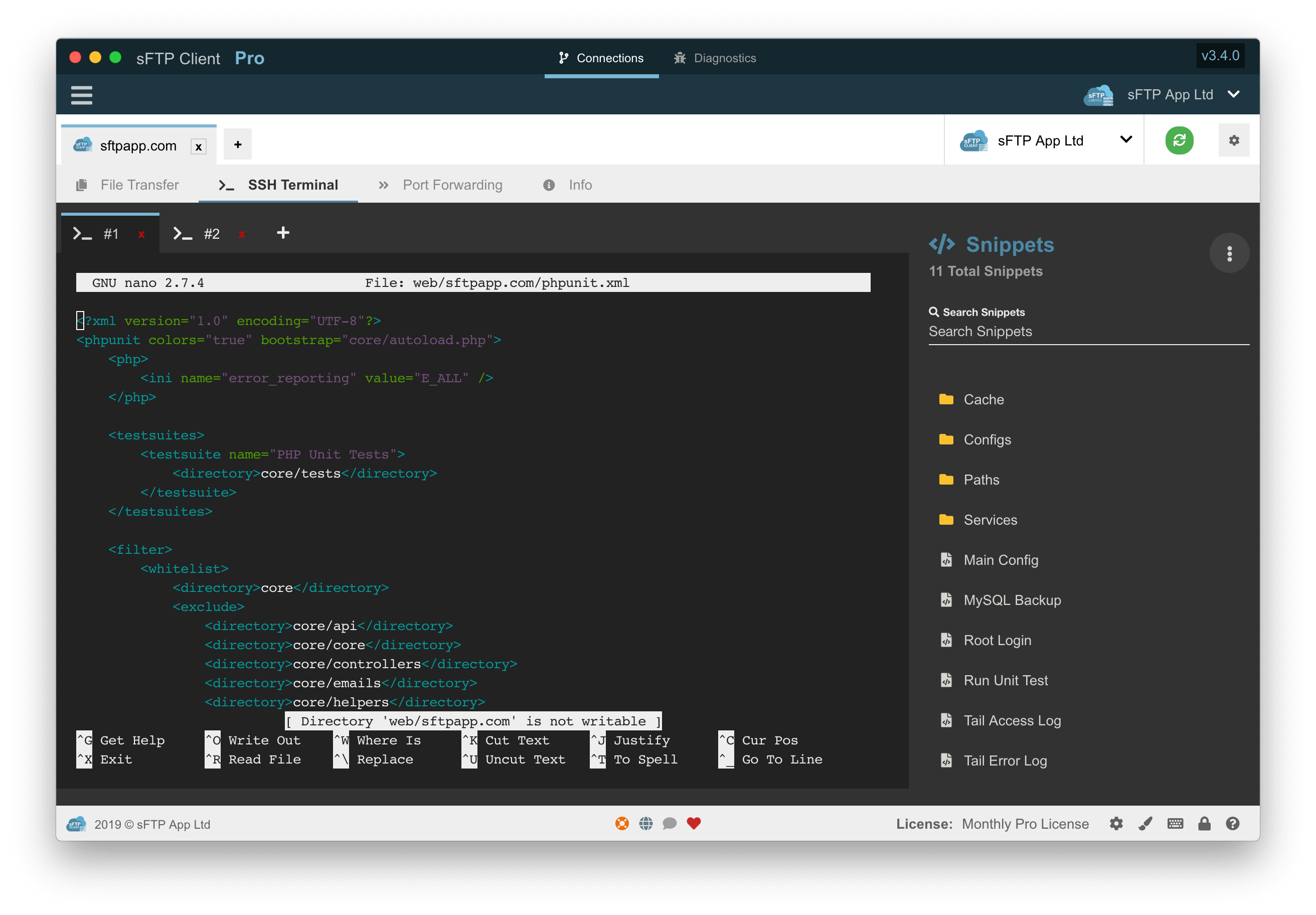 Connect to your servers shell process to perform additional tasks when you need to achieve more than just file transfers. If you use SFTP connections a SSH Terminal session will automatically be opened allowing you to switch between the two whenever you like.